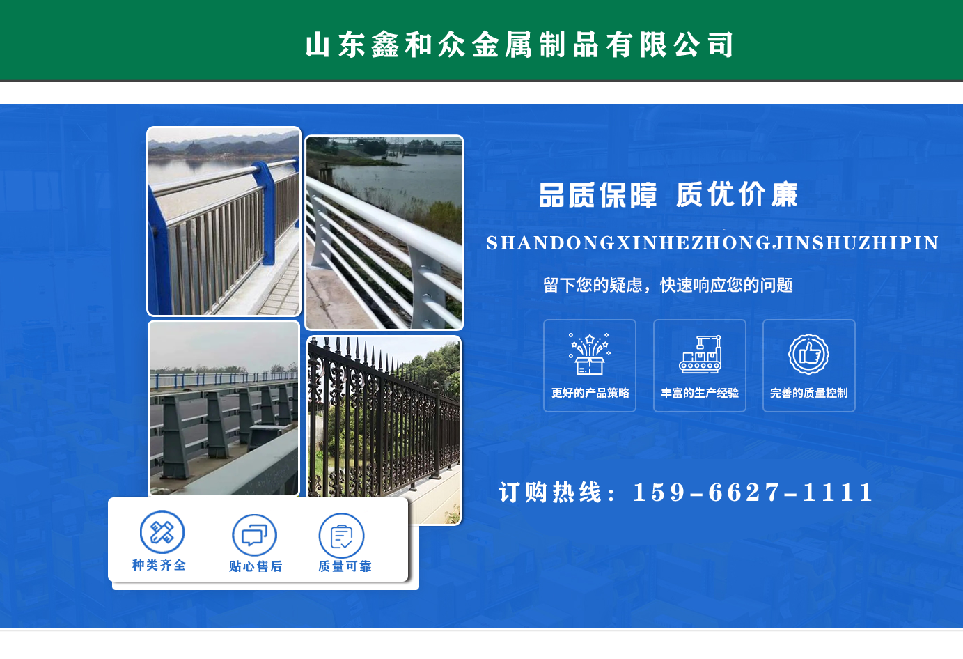 山東鑫和眾金屬制品有限公司主要產品有防撞護欄,橋梁護欄,道路護欄,河道護欄,不銹鋼護欄等護欄。提供設計方案,一站式定制,包您滿意價格優(yōu)惠,歡迎來電咨詢! 公司常年從事銷售護欄防撞護欄,橋梁護欄,道路護欄,河道護欄,不銹鋼護欄,橋梁鋼護欄,河道燈光護欄等。產品廣泛應用于橋梁、河道、旅游景區、道路、公路、公園、小區、景觀、道路防撞等領域?! 」井a品均采用優(yōu)質不銹鋼材料,符合相關標準。各種型號不銹鋼復合管及護欄,質量嚴格把控。產品強度高、耐腐蝕、焊接牢固、抗沖擊、性能好,防撞護欄結構簡單、美觀實用大方?! g迎前來訂購!...